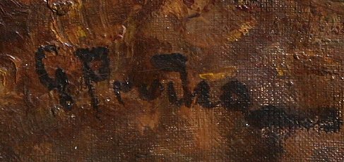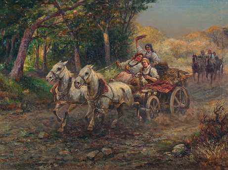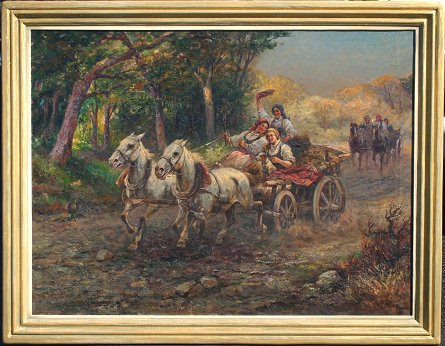 PRUCHA, Gustav, (Austrian, 1875-1952): Carriage scene, Oil/C, 30'' x 40'', signed, painted frame, 35 1/2'' x 46''. Several small patches visible verso, several minor paint flecks, some stretcher bar wear, needs cleaning.