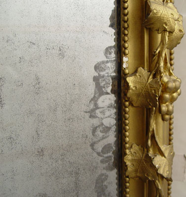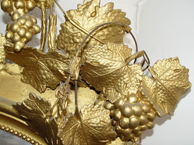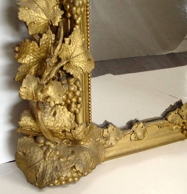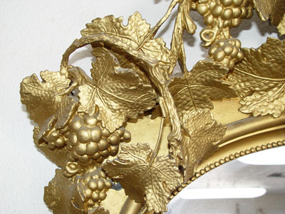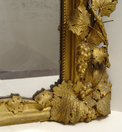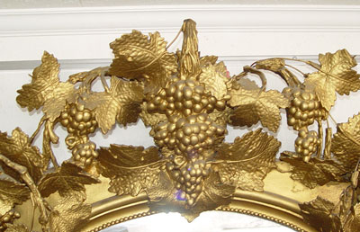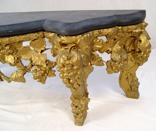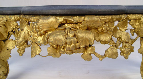 19th C GILT GESSO PIER MIRROR WITH SLATE TOP TABLE: Arched top looking glass framed in gilt gesso frame with pediment dripping with grapes, the base adorned with foliage. The matching gilt wood table, also well decorated, is covered in beveled black slate. Original glass. Mirror is 92''h. x 34'' wide. The table is 11''h. x 33'' wide.