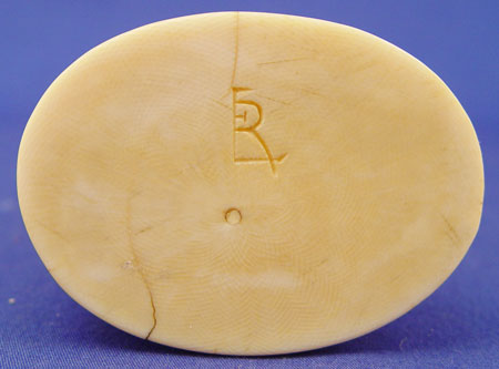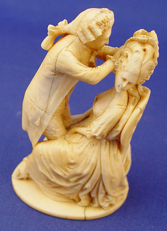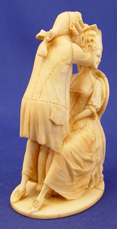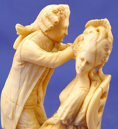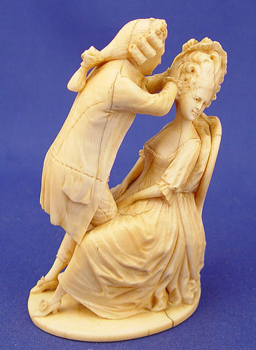 EUROPEAN EROTIC CARVED IVORY FIGURE: Signed with monogram (EP?, FR?) under base. Depicting French Neoclassical figures, perhaps Marie Antoinette and her hairdresser, Leonard. Carved from one piece. 4 1/2''h. x 2 3/4'' length of base.