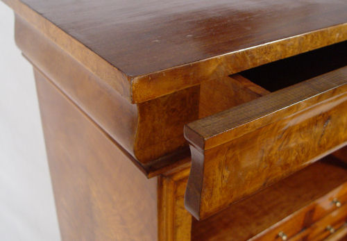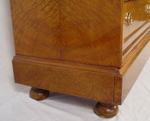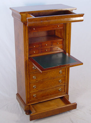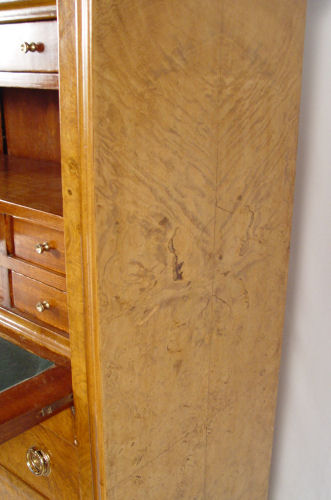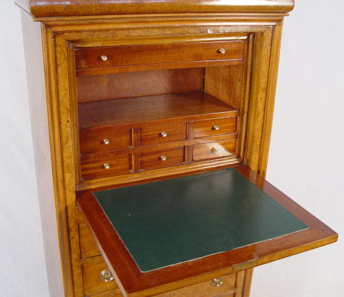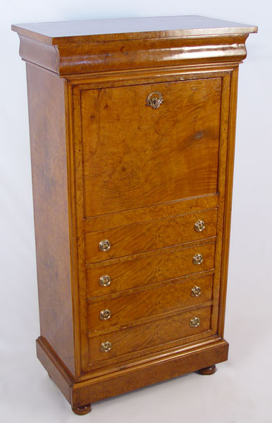FRENCH SECRETAIRE ABATANT: Burl wood veneer. Fall front desk with compartmented interior and leather writing surface. Secret drawer across the base, bun feet. 57 1/2'' high x 30 1/4'' wide x 16'' deep.