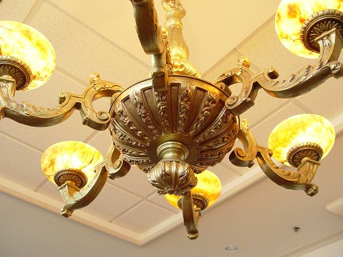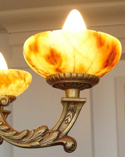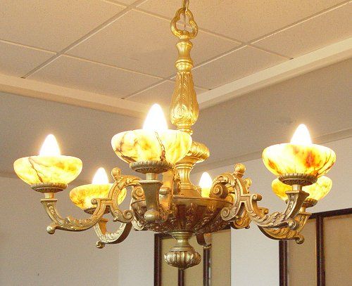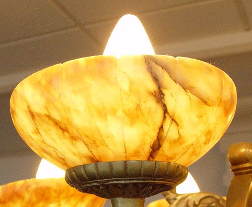 BRONZE CHANDELIER WITH ALABASTER SHADES: 6 lights and shades, 28'' high x 31'' dia.