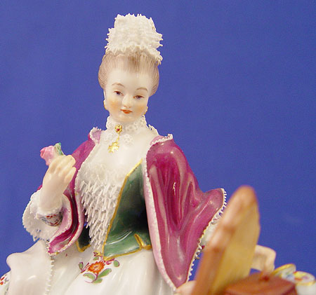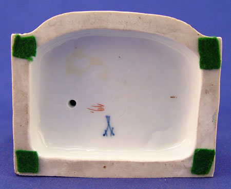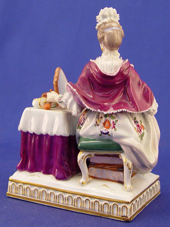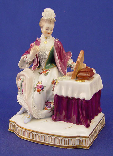 MEISSEN GERMAN PORCELAIN FIGURE OF WOMAN AT HER DRESSING TABLE: Blue cross sword marks under glaze, 5 1/2''h., 5 1.2'' x 3 1/4'' at the base.