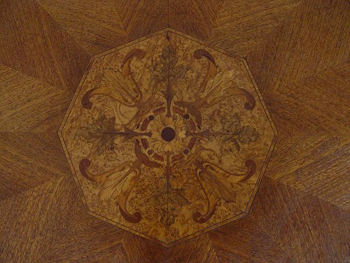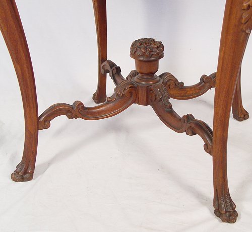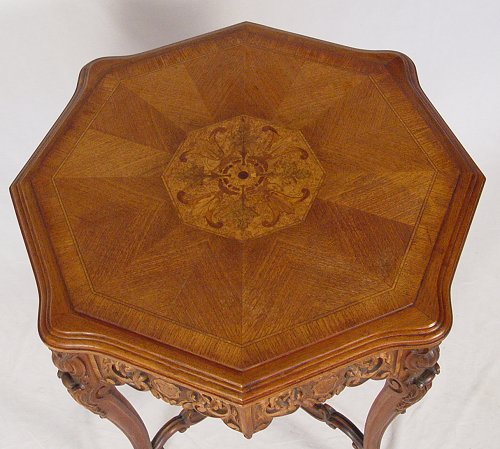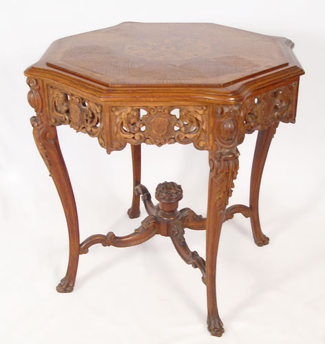 OCTAGONAL CARVED & INLAID PARLOR TABLE: Matchbook veneer top centers an inlaid medallion. Carved apron, paw feet curved stretchers join a flower filled urn finial. Measures 30 1/2'' high x 33 1/2'' dia.