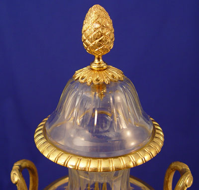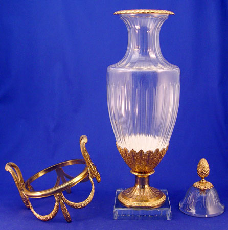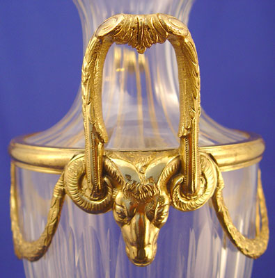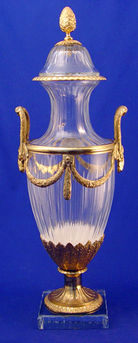 LARGE CRYSTAL URN WITH BACCARAT SIGNED GILT METAL MOUNTS: Heavy fluted cut glass with gilt metal decoration. Mounts have ram's head and floral design. Marked Baccarat and France on mounts. Heavy crystal base. 22 1/4'' high overall. The crystal base is 5'' square.