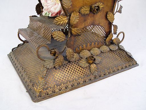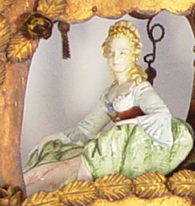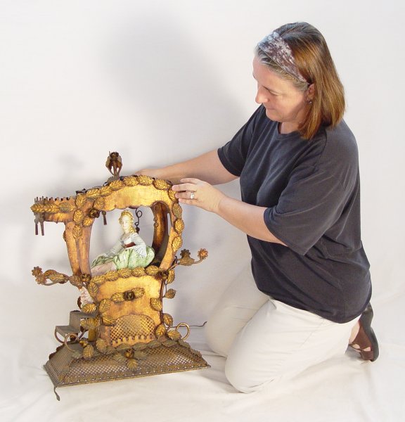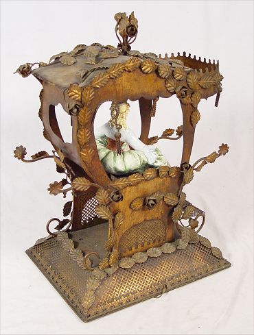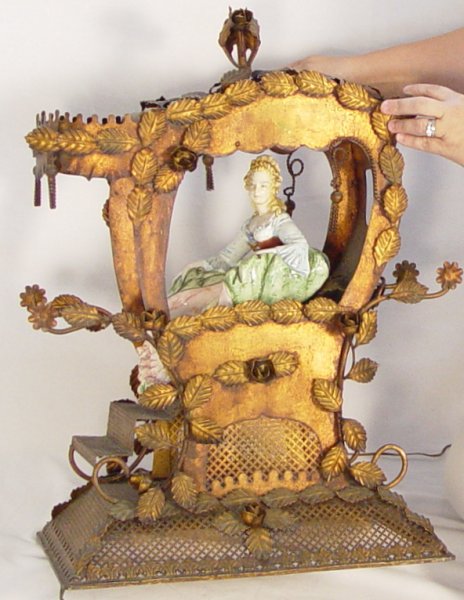 LARGE ITALIAN CARRIAGE LAMP WITH MAJOLICA FIGURE: Metal work carriage, lamp with light above and below, transporting a lovely lady. 25 1/2'' tall, 19 1/2'' w. x 13 1/4'' d.