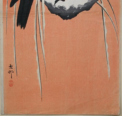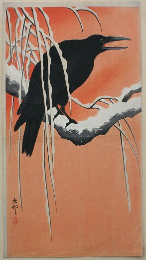 OHARA KOSON, (Japanese, 1877-1945): ''Crow On A Snowy Bough'', W/B Print, size with margins 14'' x 7 5/8'', tipped to backing. Condition - Some soiling in the margins, creasing in right corner, fold in center, no tears or rips.