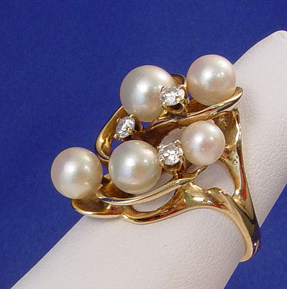 PEARL & DIAMOND RING: Open swirling mount of 18k yellow gold set with 5 pearls ranging in size from 5mm to 6.5mm in size, accented by three diamonds, size 7.5, 8 grams.