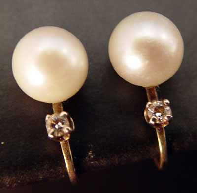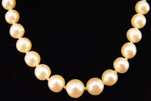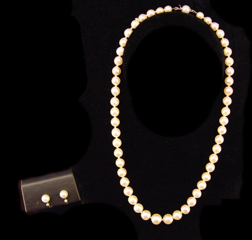 PEARL NECKLACE WITH EARRINGS: 17'' long 9.5 mm graduated to 7.2 mm, double knotted, classic white pearl necklace with pressure clasp. 7.2 mm white pearl earrings with hoop screw backs.