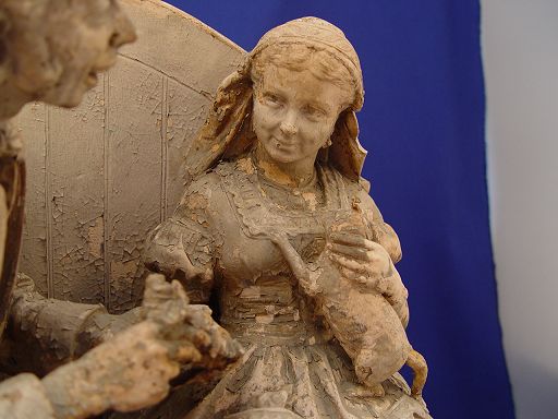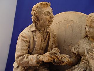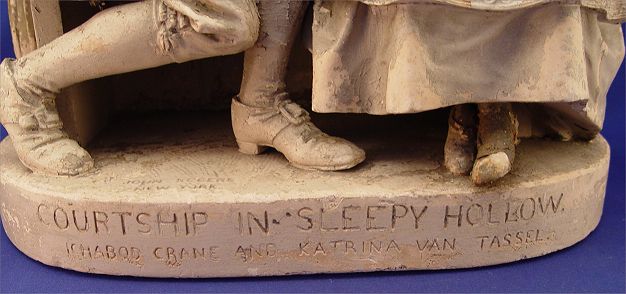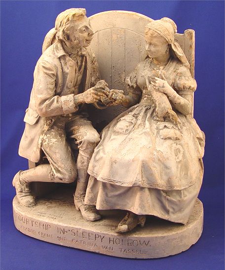 JOHN ROGERS GROUP ''COURTSHIP IN SLEEPY HOLLOW'': Ichabod Crane and Katrina Tassel. Plaster statue with original paint in worn condition. 16 1/2''h. x 15'' x 8''.