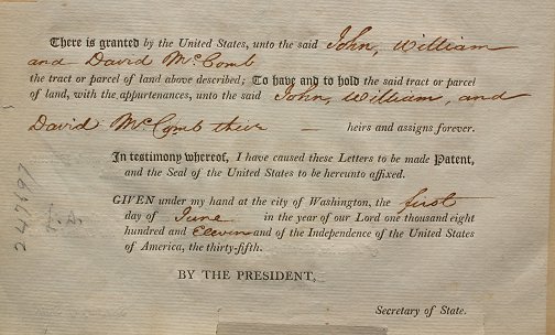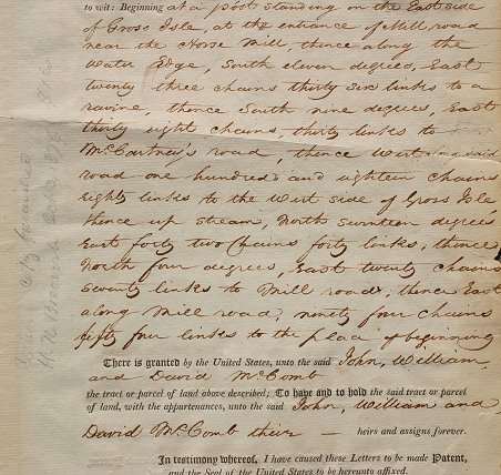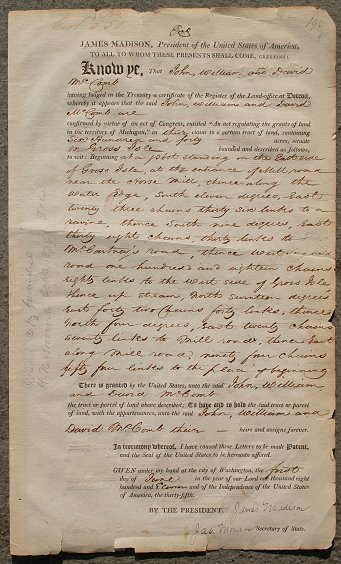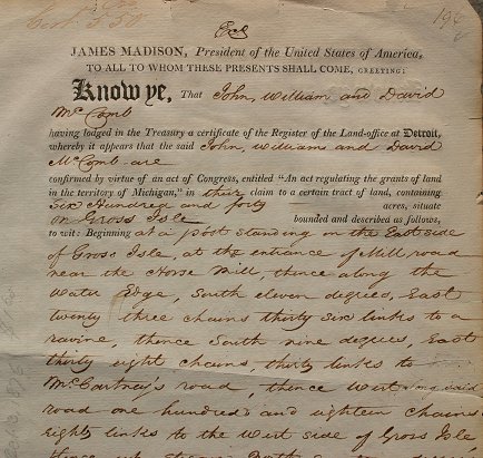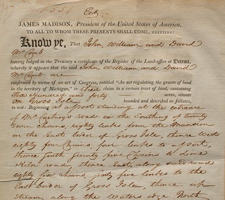 1811 ORIGINAL GROSS ISLE MICHIGAN LAND GRANT MONROE: Dated June 1st 1811 and signed by James Madison and James Monroe. We believe the signatures to be secretarial as both look alike. Original land grant to John, William and David McComb for 640 acres on Gross Isle, Michigan. Paper has some minor tears along edges, fold and pencil writing on side dated 1876. Tears do not affect text. Measures 14 1/2'' x 8 3/4''.
