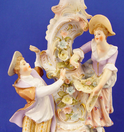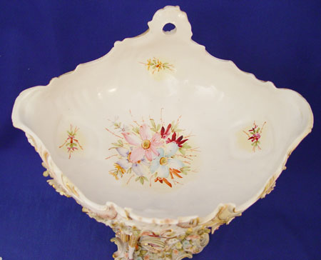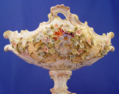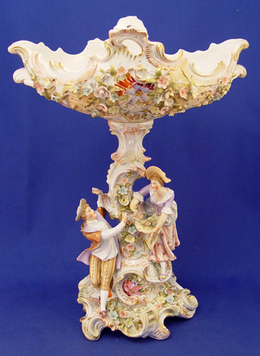 SITZENDORF FINE GERMAN PORCELAIN CENTERPIECE COMPOTE: Tall pedestal with figures and applied flowers, scrolled feet, gilt accent. The bowl has hand painted interior, applied flowers and same attention to detail as the base. Cross line mark. 15 1/4''h. x 11''w. overall.