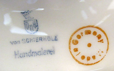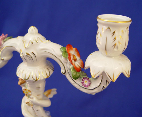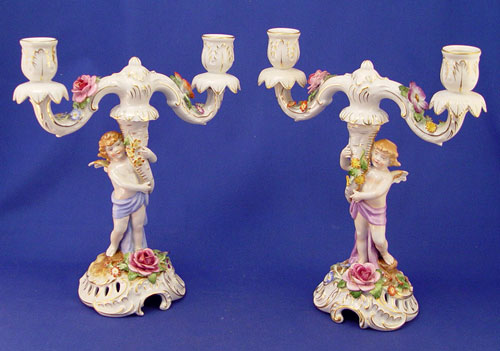 PAIR SHIERHOLZ GERMAN PORCELAIN CANDELABRA: Winged cherub holding cornucopia. Two part construction, 11 1/2''h. x 9 1/2'' wide.