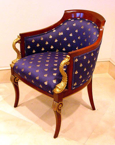 PAIR OF DECORATIVE FRENCH STYLE DOLPHIN CARVED CHAIRS BY COUNCIL FURNITURE: Upholstered in a French bee fabric. 32 3/4'' high x 22 1/2'' wide x 25 1/2'' deep