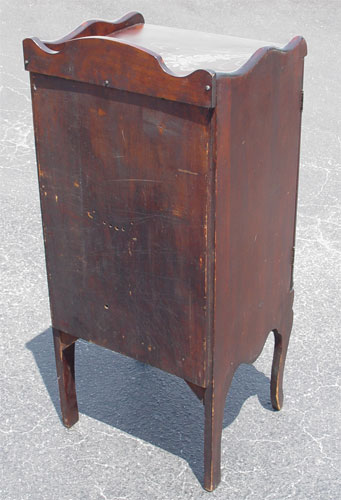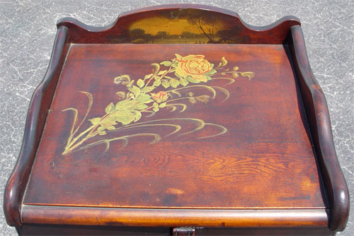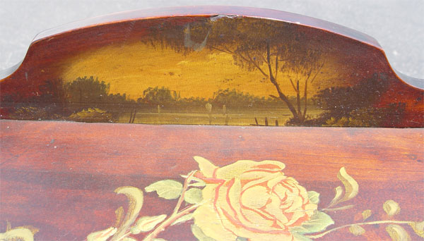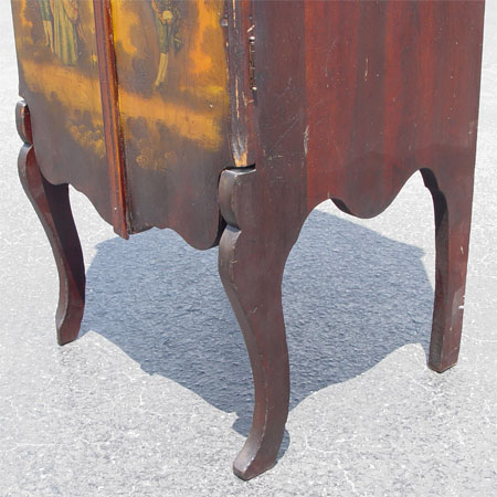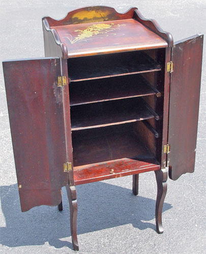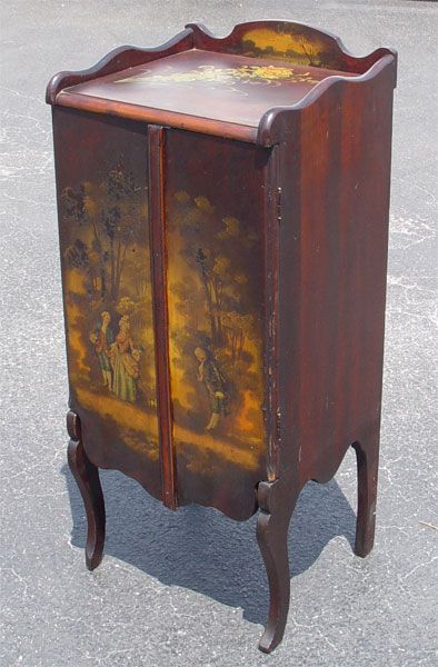 PAINT DECORATED MUSIC CABINET: French scene joins on the two doors, 3 shelf interior. Paint is in worn condition. 41 1/4'' high x 17 3/4'' wide 16'' deep.