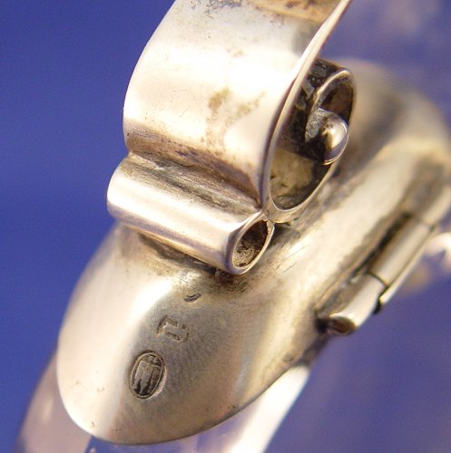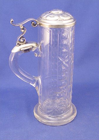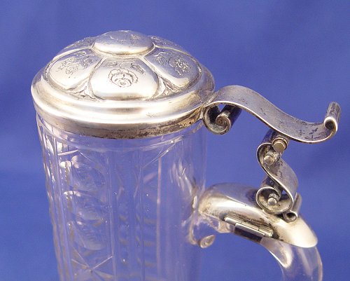 DANISH SILVER MOUNTED CUT GLASS STEIN: Cut glass body with olive and star cuts. Danish sterling hinged lid with Danish 1904 stamp and J. Holm maker stamp. 8 5/8'' tall. Please note scratches on glass base.