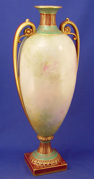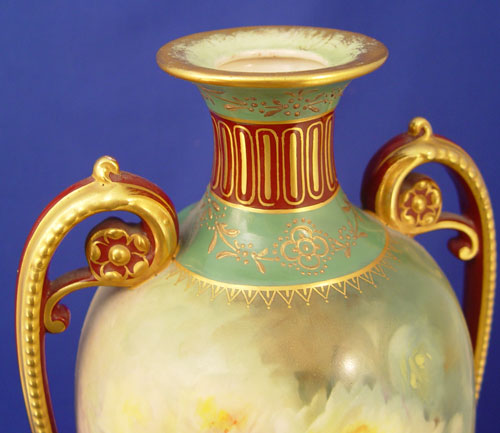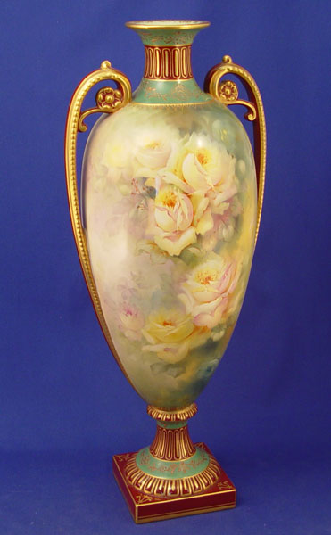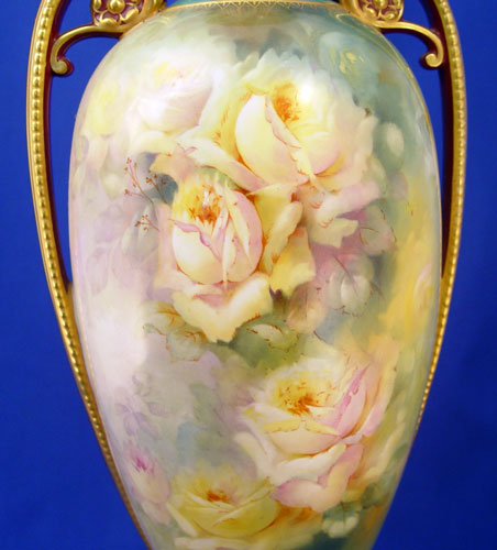 ROYAL BONN HAND PAINTED PORCELAIN VASE: Hand painted with yellow roses, artist signed M. Dirkmann. Marked Royal Bonn Germany 1755 under base. 18 1/2''h.