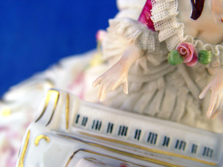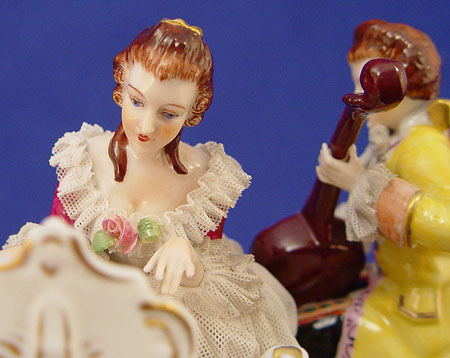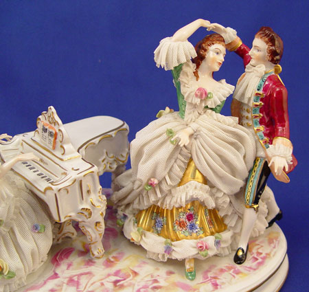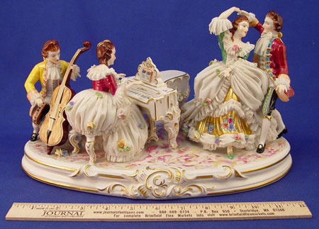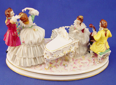 LARGE VOLKSTEDT FINE GERMAN FIGURAL GROUP OF LACY FIGURES: Enjoying a joyous evening of music. Pianist, cellist and dancers. 12 1/2''h. x 7 1/2''. Muller & Co., Volkstedt, Germany.