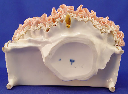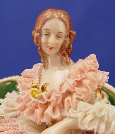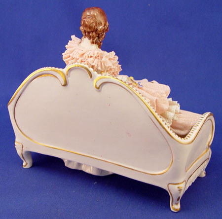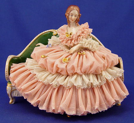 FINE GERMAN PORCELAIN SEATED LACY FIGURINE: Crown mark, (Dresden, Furstenburg, or Volkstedt). Lady seated on a sofa, dressed in layered pink lacy gown. 6 3/4'' h. x 7 1/2''.