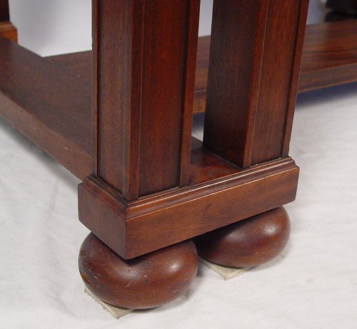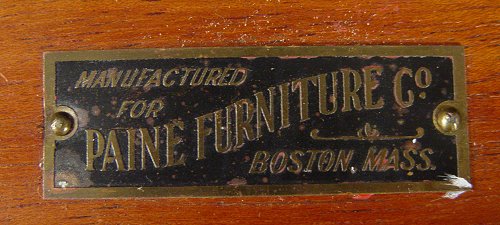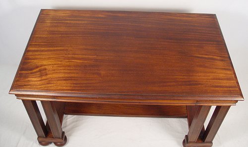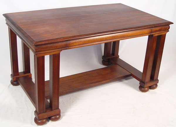 PAINE FURNITURE MAHOGANY LIBRARY TABLE: Striped mahogany top with protective glass. One drawer, double square columnar legs, bun feet. 29''h. the top surface is 32 x 54. Paine Furniture, Boston Mass.