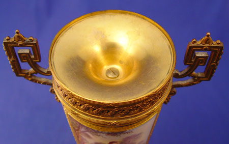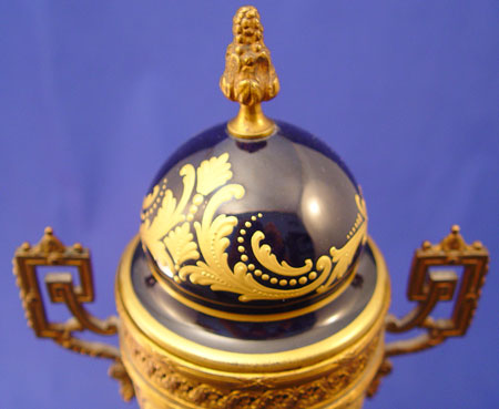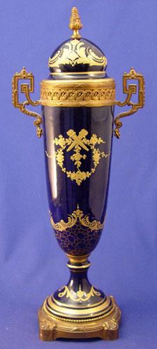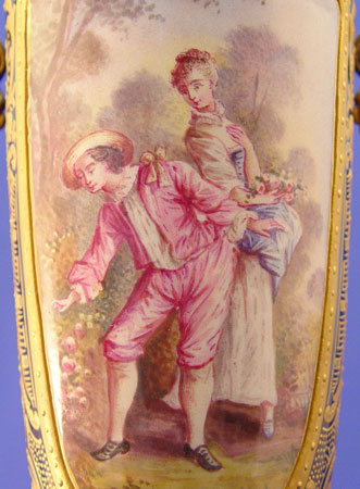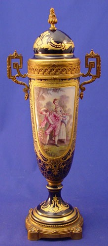 ARTIST SIGNED SEVRES FRENCH PORCELAIN COVERED URN: Cobalt and gilt embellished porcelain centering the handpainted image of a courting scene. Signed H. Pailevin. 17 1/4'' tall overall.