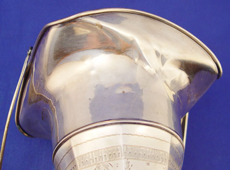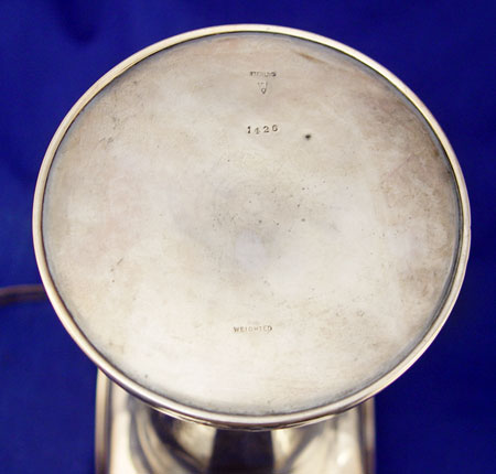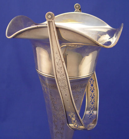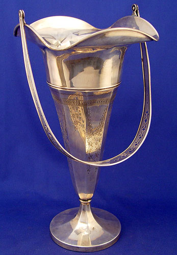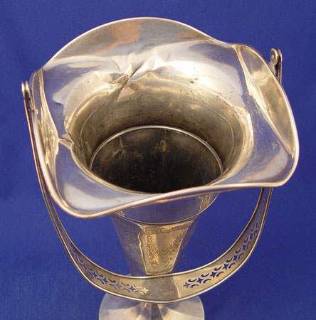VANDERBILT STERLING TRUMPET BASKET VASE: Early 20th century by Clarence Vanderbilt. 14 1/4'' high with inscribed floral decoration on body. Swivel handle has pierced design and inscribed floral decoration. Weighted sterling base. Please note condition.