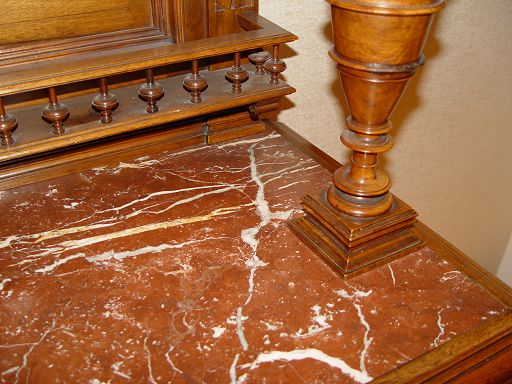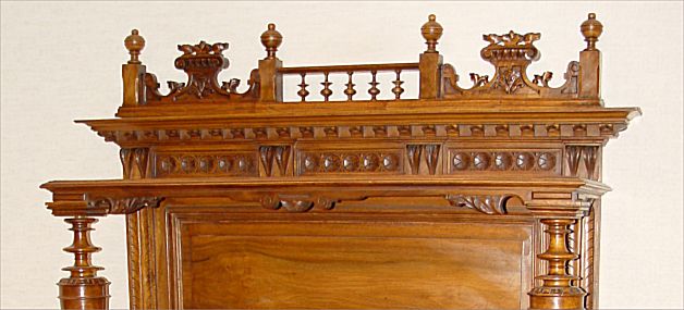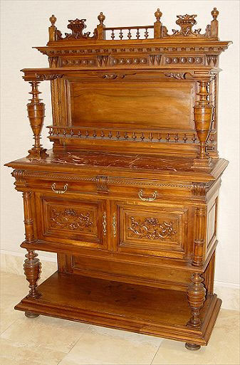 VICTORIAN CARVED WALNUT & MARBLE SIDE CABINET: Intricate carvings and spindles throughout. Plate rail between upper shelf and recessed marble top. 2 drawers over cabinet doors over open shelf at the base. Measures 6' tall x 47'' wide x 20'' deep.