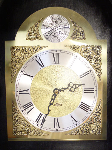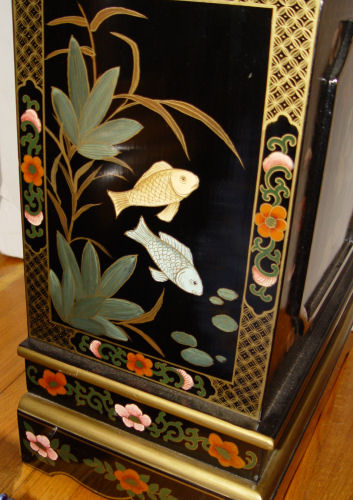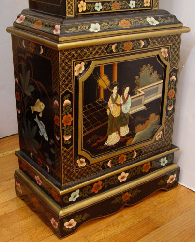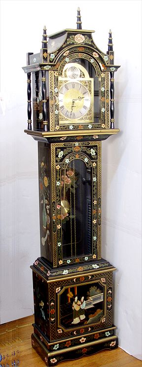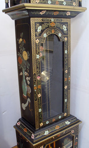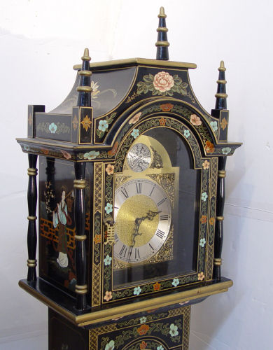 CHINOISERIE GRANDFATHER CLOCK: Western Germany, made by Schatz. Weights and pendulum included. Gong strike on the hour and half. 79''h. including finials, 17 1/2'' x 11 3/4''.