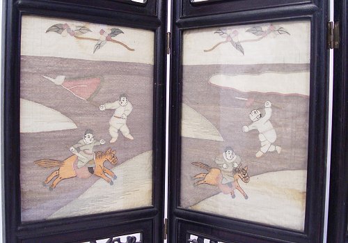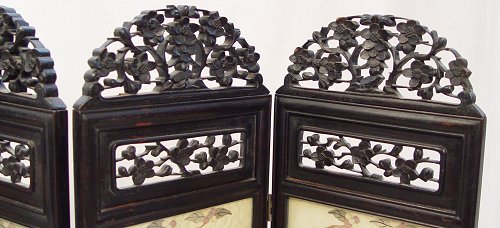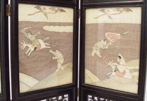 4 PANEL CHINESE TABLE SCREEN WITH SILK PANELS: Carved hardwood screen, with silk panels under glass. 24''h., all four panels extend to 40'' long.