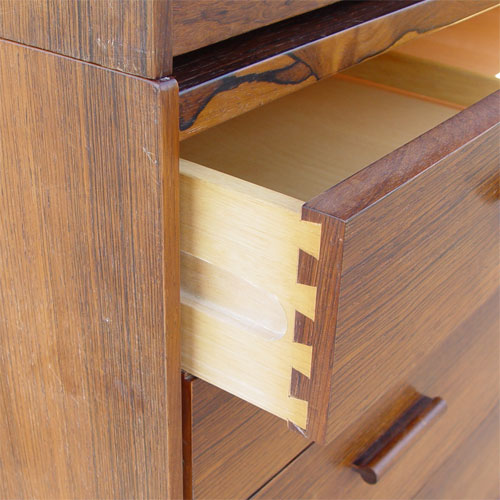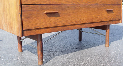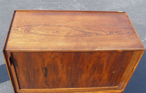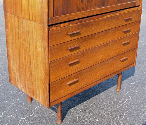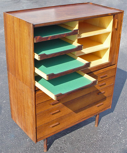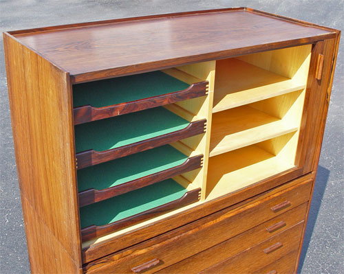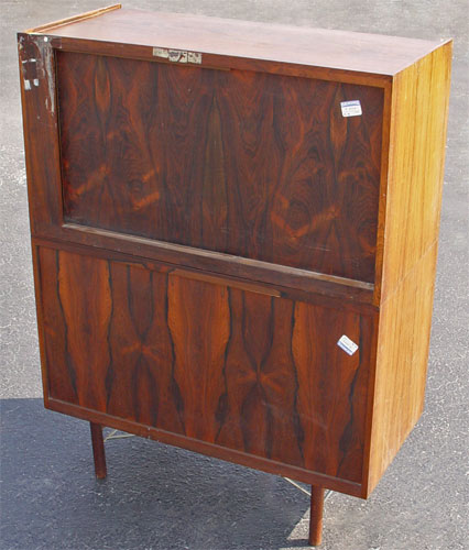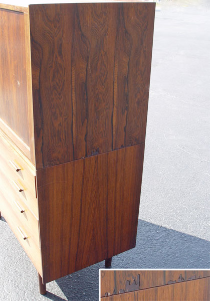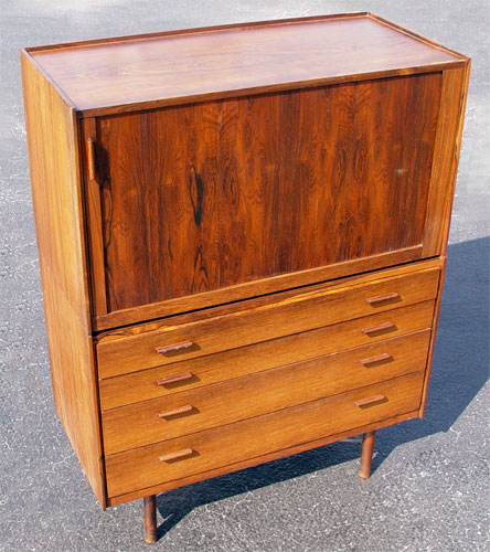 HIGH END DANISH MODERN ROSEWOOD 2 PART BACHELORS CHEST: Upper section with sliding tambour front. Front opens to 2 shelves and 4 sliding shelves. Bottom section has 4 drawers. 53 3/4'' high x 41'' wide x 19 1/2'' deep. Please note chips to veneer on upper section.