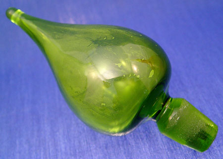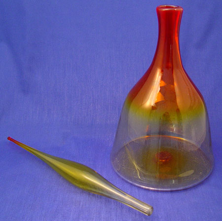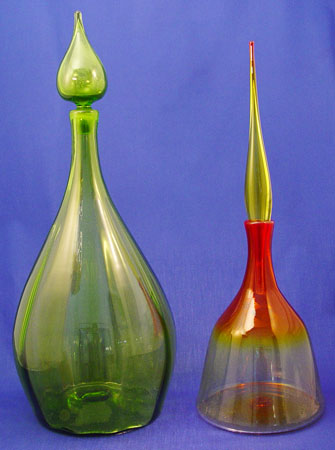 2 BLOWN GLASS BOTTLES: Blenko orange to yellow, 20''h. and green glass, 22''h. Both with stoppers.