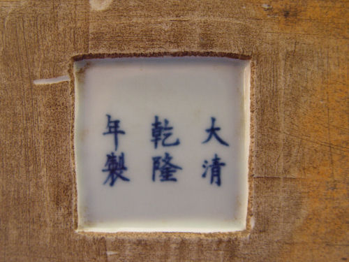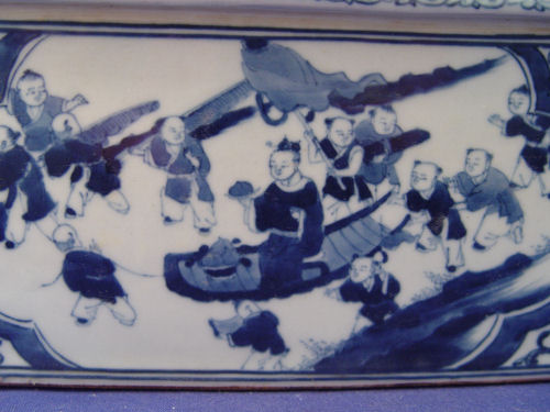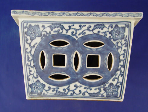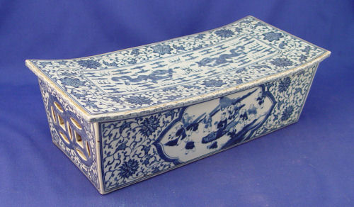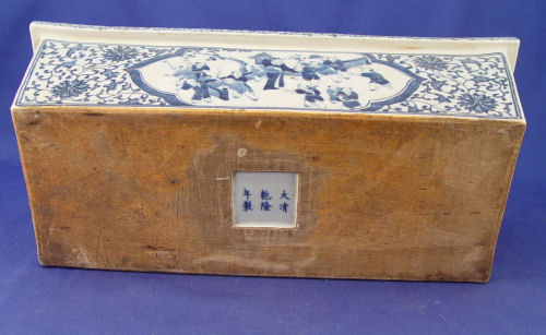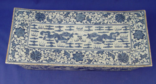 19TH CENTURY CHINESE BLUE & WHITE PORCELAIN PILLOW: 4 1/2'' high with an arched center x 15'' long, signed in characters.