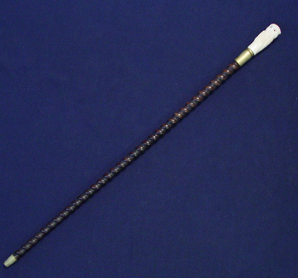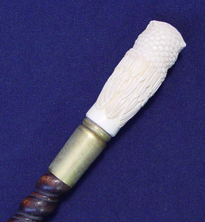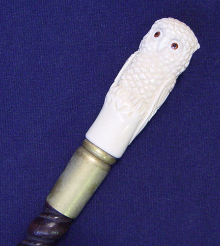 CARVED IVORY HANDLE CANE SEATED OWL DESIGN: Carved ivory handle depicts a seated owl with glass eyes. 2 pieces together. Barleytwist hardwood staff with brass ferrule and tip. Cane measures 36 1/4'' high. Note minor scratches on shaft.