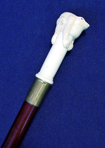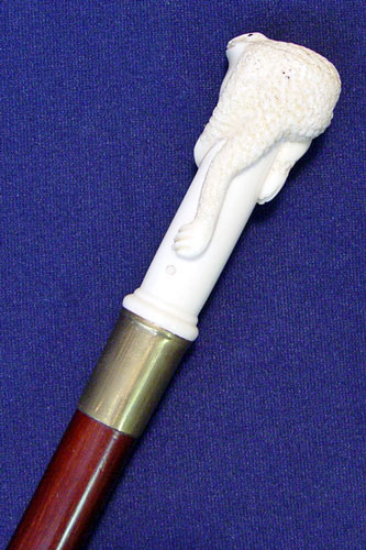 CARVED IVORY HANDLE CANE RESTING FROG DESIGN: Carved ivory handle depicts a resting frog. Frog appears to be pieced together. Hardwood staff with brass ferrule and tip. Cane measures 35 1/2'' high. Note minor scratches on shaft.