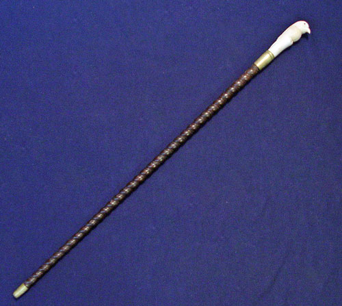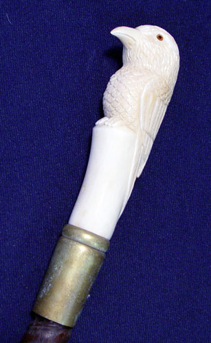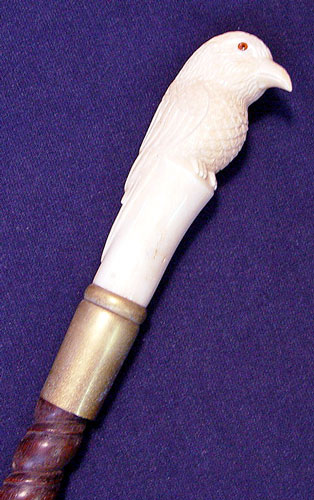 CARVED IVORY HANDLE CANE ORNATE BIRD: Carved ivory handle depicts a seated bird with glass eyes. Barley twist hardwood staff with brass ferrule and tip. Cane measures 36'' high. Note scratches on shaft.