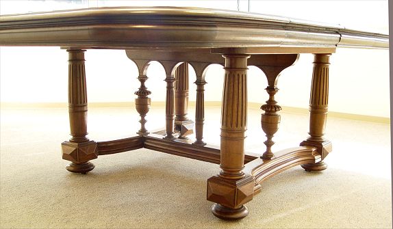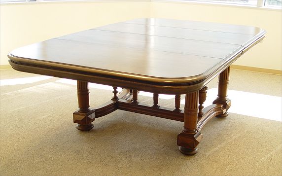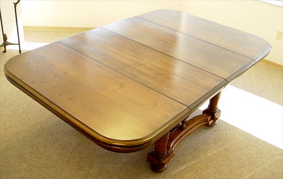 VICTORIAN STYLE DINING TABLE 2 LEAVES: Walnut top with heavy turned column legs. Urn and column cross stretcher. Measures 30'' high x 46 1/2'' wide x 55'' deep closed. 2 leaves measure 19 1/2'' across each.