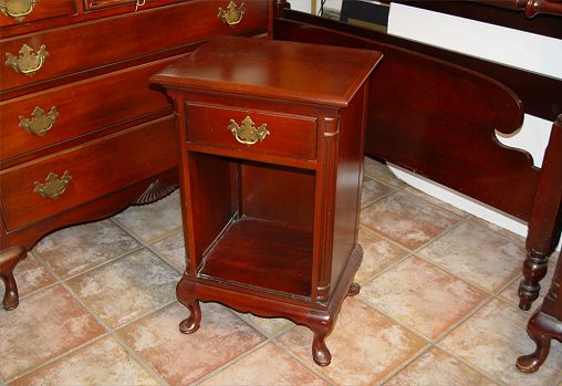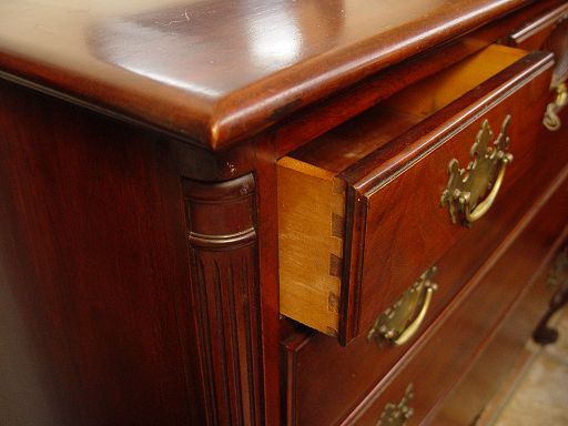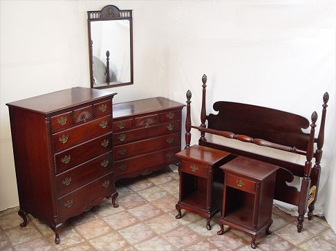 DREXEL OLDE SALEM MAHOGANY BEDROOM SUITE: To include 1) Full size bed with pineapple finials, posts are 54'' at the head, 48'' at the feet. 2) Tall chest, 3 over 4 drawers, with top center having shell carving. 3) Chest of drawers, 3 over 3 drawers. 4) The pair of matching nightstands.