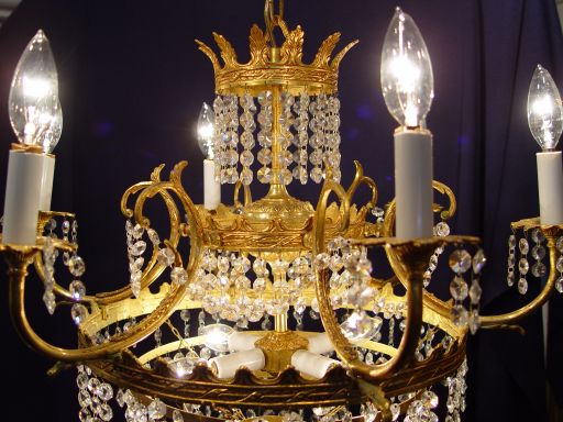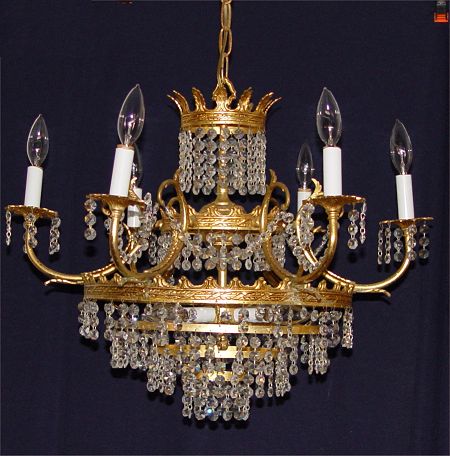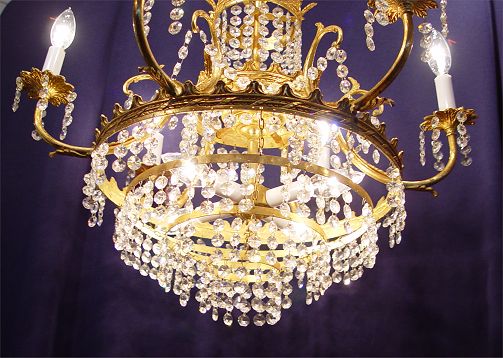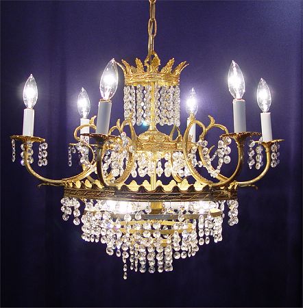 CRYSTAL CHANDELIER: 9 light chandelier hanging chains of prisms. 24'' dia. x 18''.