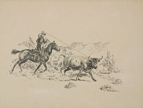 BUGBEE, Harold Bow, (American, 1900-1963): Steer Roping, Pen & Ink Drawing, sight size 12'' x 16'', paper size 12 1/2'' x 17 1/2'', signed, silver gilt frame, 18 1/2'' x 22 1/2''.