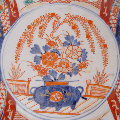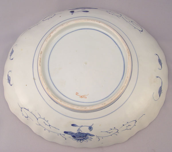 JAPANESE IMARI OVAL BOWL: Unusual form decorated in cobalt blue and iron red, 12 1/2'' high x 10 3/4'' oval.