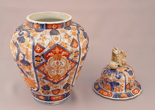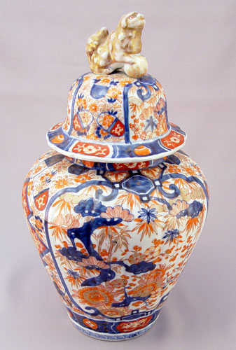 JAPANESE IMARI COVERED JAR: Figural finial on lid, cobalt and iron red decoration. Signed on the underside. 13'' high