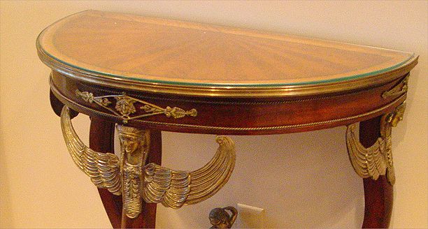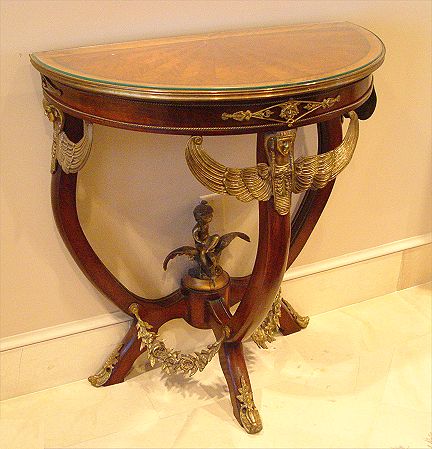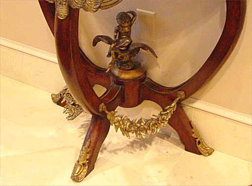 FRENCH DEMI FOYER STAND: Parquetry inlay top framed in ormolu. Egyptian masqueron at the top of each leg, cupid on swan finial join the 3 legs at the center and rose swags join them on the outside. Measures 35 1/2'' high x 31'' wide x 16 1/2'' deep.