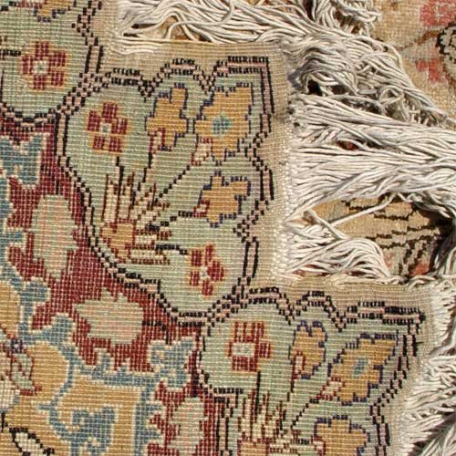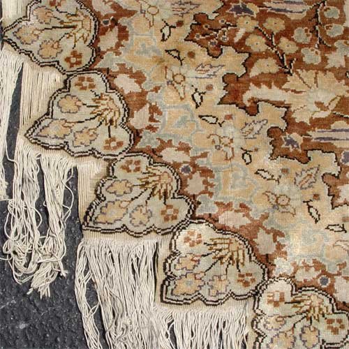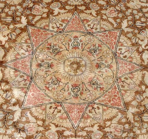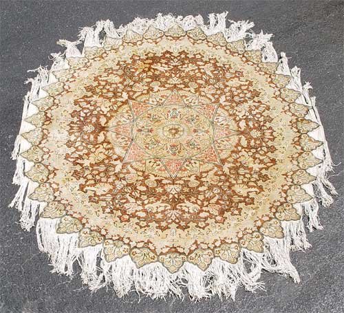 ROUND ISLAMIC CARPET: Star shaped with fringe connecting the points. Cotton or silk, 6'5'' round.