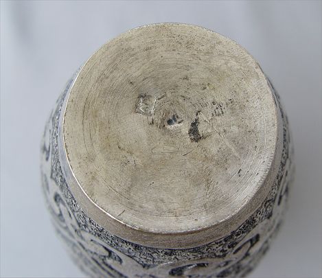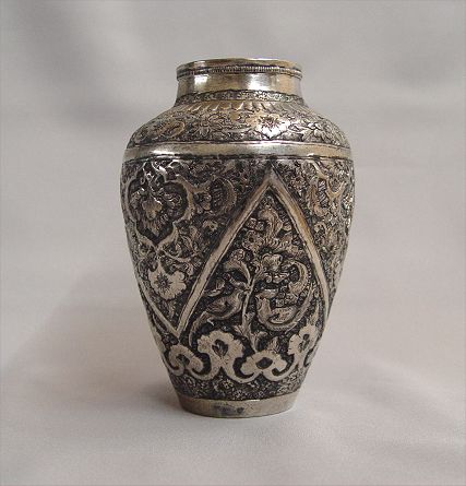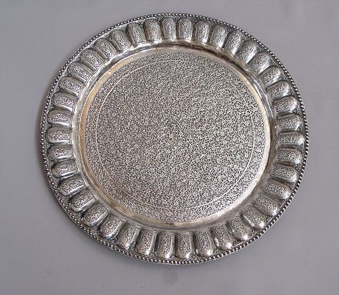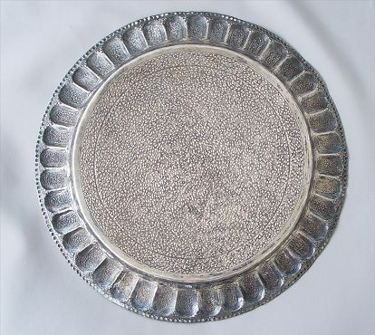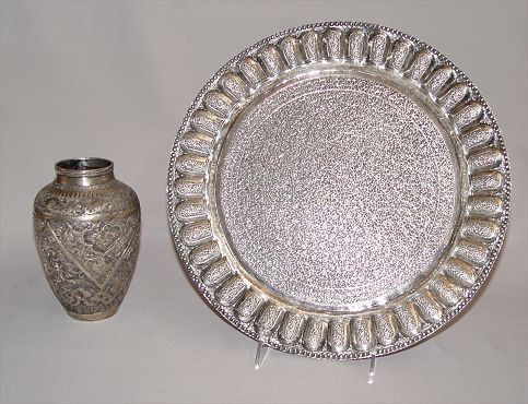 2 PIECE HAND CHASED SILVER LOT: Metal content & maker unkown. Platter measures 11 3/4'' dia. Vase measures 5 1/2'' high.