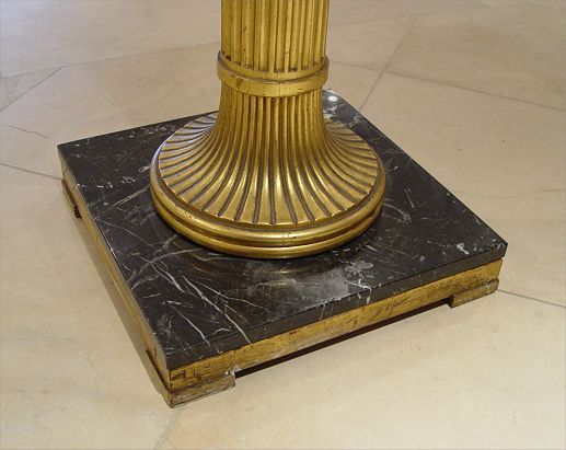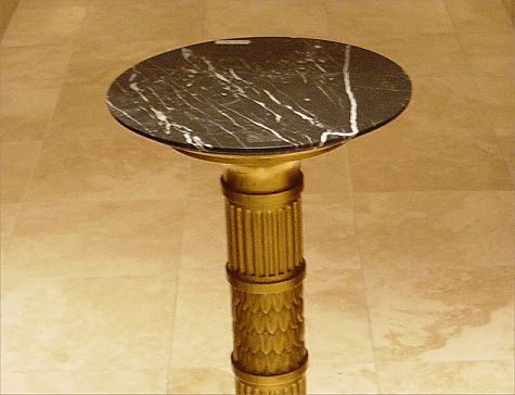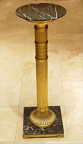 BLACK MARBLE TOP PEDESTAL STAND: Gold gilt-wood column. 43 1/2'' tall, top is 14 1/2'' dia. and marble layer over wood base approximately 14 1/4'' x 14 1/4''. Very small chip on top.