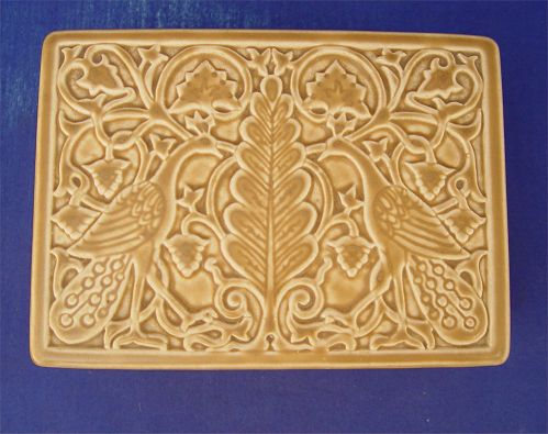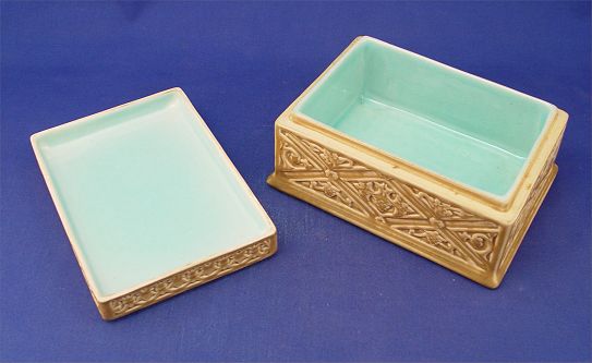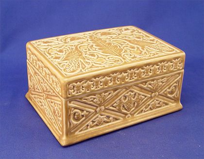 ROOKWOOD POTTERY COVERED BOX: Peacock design on lid. 1920 date stamp. No chips or cracks. Signed with Arthur P. Conant's mark. Measures 3 1/2'' high x 6 1/2'' wide x 4 3/4'' deep.
