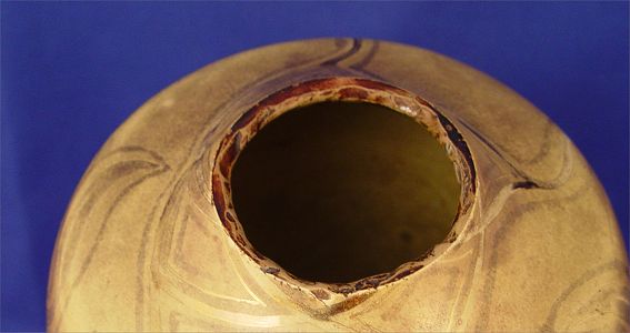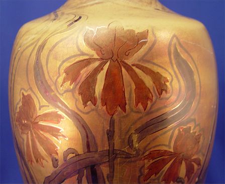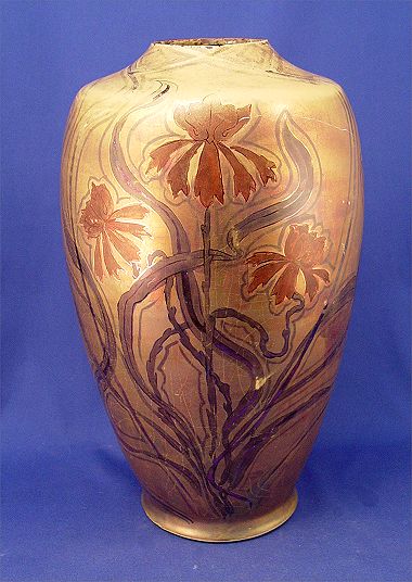 OWENS OPALESCE ART POTTERY VASE: Iridescent glaze with stylized floral decor. Please note neck has been cut down and the surface is scratched. 12 3/4''h.
