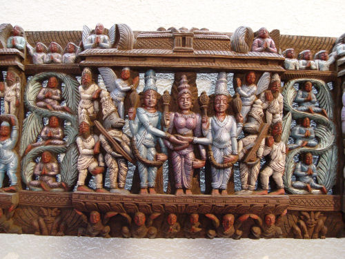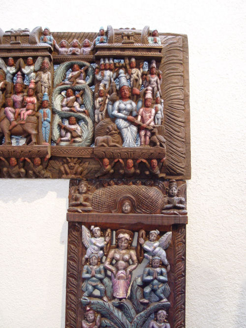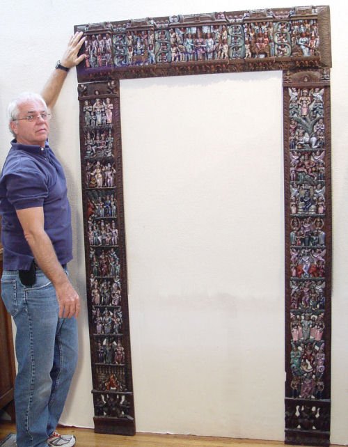 3 PC SOUTH INDIAN FIGURALLY CARVED TEMPLE DOOR FRAME: Intricately carved figures, still retaining a lot of the colorful finish. 85'' tall x 50'' wide x 32'' entry.