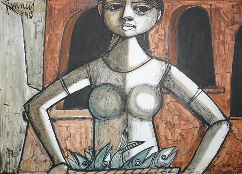 RANUCCI, Lucio, (Italian, 1925-): Girl with Fish, W/C, 13 1/2'' x 18'', signed, dated 1968, encased in carved frame, 25 1/2'' x 30''.
