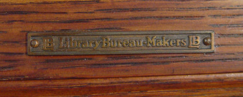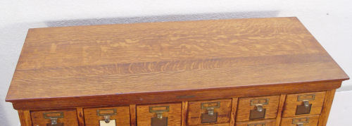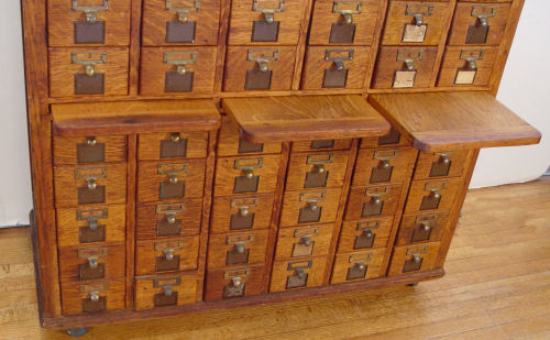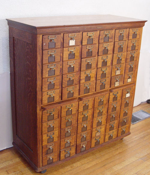 60 DRAWER TIGER OAK FILE CABINET: Richly grained oak cabinet with metal tag ''Library Bureau Makers''. Sixty drawers and three pull out shelves. 47'' x 18 1/2'' x 43''.