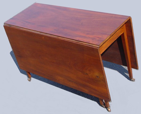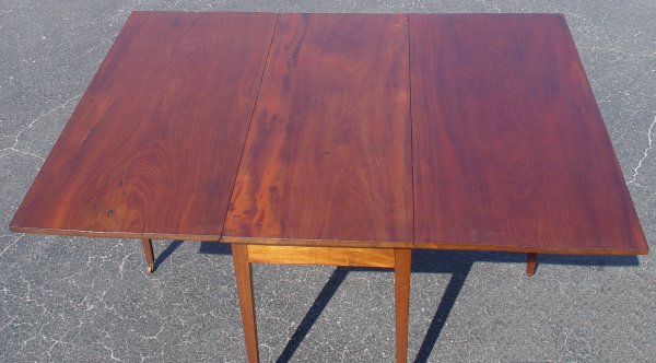 THREE BOARD DROP LEAF MAHOGANY TABLE: Tapered legs, long leaves. 29 3/4'' high x 48'' wide x 20 1/2'' deep with leaves down. Extend to 64'' long with leaves up. Supported by swing legs.